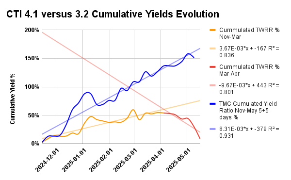 For the six months period November 2024 to May 2025, by following the CTI Insights you could have obtained around a 20% per month sustained yield.